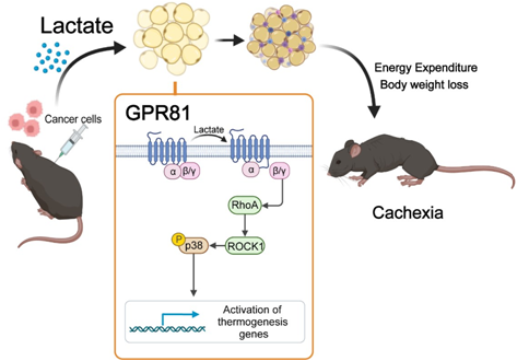 研究团队发现,肺腺癌患者血液乳酸浓度显著升高,且与体重下降程度高度相关。此外,患者在肿瘤切除后血乳酸水平显著下降,说明肿瘤是血乳酸升高的主要原因。在正常小鼠中,通过皮下植入渗透压泵递送乳酸提高小鼠血乳酸水平,可以再现典型的恶液质表型。在恶液质发展过程中,脂肪组织的变化早于骨骼肌。研究发现在高度表达GPR81的脂肪细胞中敲除该基因,可以抵抗肿瘤引起的体重减少、以及脂肪和骨骼肌的消耗。进一步实验表明乳酸/GPR81依次激活非经典的Gβγ-RhoA/ROCK-p38途径促进脂肪细胞的棕色化。上述发现建立起了肿瘤和脂肪组织的代谢之间的联系,揭示了乳酸是肿瘤引起恶液质的关键信号分子,通过其受体GPR81及下游信号转导激活脂肪细胞棕色化,导致脂肪组织的过度消耗,随后引起骨骼肌的萎缩,为肿瘤恶液质的临床治疗提供了新靶点。