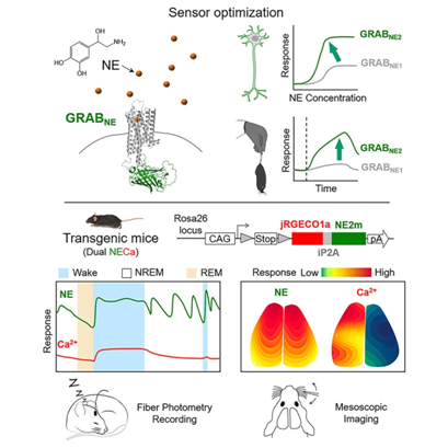2024年3月27日,李毓龙实验室在Neuron杂志在线发表了题为“使用下一代GRABNE传感器在体内监测去甲肾上腺素的释放”(Monitoring norepinephrine release in vivo using next-generation GRABNE sensors)的研究论文。该研究基于GRAB探针策略(GPCR-Activation Based Sensor),成功优化了二代绿色荧光去甲肾上腺素(NE)探针,并构建了一个新型的Cre依赖型双荧光探针表达的转基因小鼠品系,实现了在活体小鼠的多个脑区和多种行为范式下,同时且可靠地检测NE和钙信号。