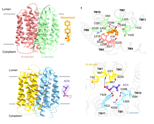 图1. VAChT识别抑制剂vesamicol和底物乙酰胆碱(ACh)的分子机制