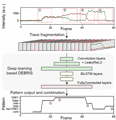 DEBRIS的核心理念在于,所有长时间尺度的单分子轨迹都是由有限类型的包含特定局部特征的短片段构建而成的。类似于俄罗斯方块中,有限的积木类型可以拼接出多种多样的复杂结构。DEBRIS模型中包含七个类别的双通道短片段强度-时间迹线,以模拟单分子双色荧光实验中常见的局部特征。在应用时,DEBRIS采取滑动窗口逐帧预测局部特征,这一过程将强度-时间轨迹转换为模式-时间轨迹(图1)。随后,根据用户定义的标准将其进一步分类为不同组别,并识别单分子事件。结合预测短片段的局部特征、滑动窗口技术和用户定义的标准,DEBRIS能够适应任意模式和任意长度的双通道荧光轨迹,为单分子荧光事件的自动识别提供了一种强大的工具。