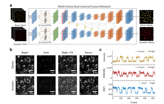 2025年1月2日,陈春来课题组与索津莉、戴琼海课题组合作,在《自然通讯》(Nature Communications)杂志发表了题目为“有监督的多帧双通道降噪实现极弱光长时程单分子FRET测量(Supervised multi-frame dual-channel denoising enables long-term single-molecule FRET under extremely low photon budget)”的研究论文,以数据驱动的方式化解成像类单分子FRET观测时长与时间分辨率的矛盾。