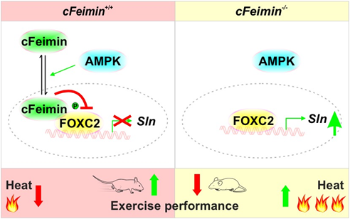 图1. 运动后cFeimin入核,抑制Sln表达进而减少肌肉产热并提高运动耐力)