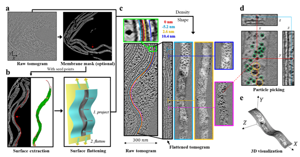 该方法首先通过膜分割或者手动标注定位感兴趣区域(一片膜),然后在tomogram中对这片膜及其周围的区域进行变形处理,最终把这个局部区域展平为一个包含平整膜结构的新tomogram,也就是展平tomogram。在这个新生成的展平tomogram中,原本弯曲的膜会变成一个平板,膜厚度与蛋白取向局部保持不变。展平tomogram中每一层二维截面都对应一个平行于膜的等距面,使得膜表面的蛋白信号可以轻易地以二维图像的形式被展示。这起到了降维的效果,降低了膜蛋白分析的空间复杂性,改善了膜上和膜周围蛋白质的可视化效果。