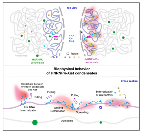 研究者发现,Xist与核不均一核糖核蛋白K(HNRNPK)共同驱动液-液相分离(LLPS),将染色体包裹起来。内化的Xist诱导HNRNPK液滴进一步发生相变,将其“软化”。Xist在体外能改变凝聚体的可变形性、黏附性和润湿性,并将其他 Xist相互蛋白捕获于液滴之中,导致Xist与其他蛋白质协同因子在凝聚体中进一步富集。研究团队将液-液相分离归因于HNRNPK的RGG和Xist的 RepB基序,突变这些基序会导致Xist扩散,破坏多梳抑制复合物的招募,并阻止Xist迁移所必需的染色体区室混合。