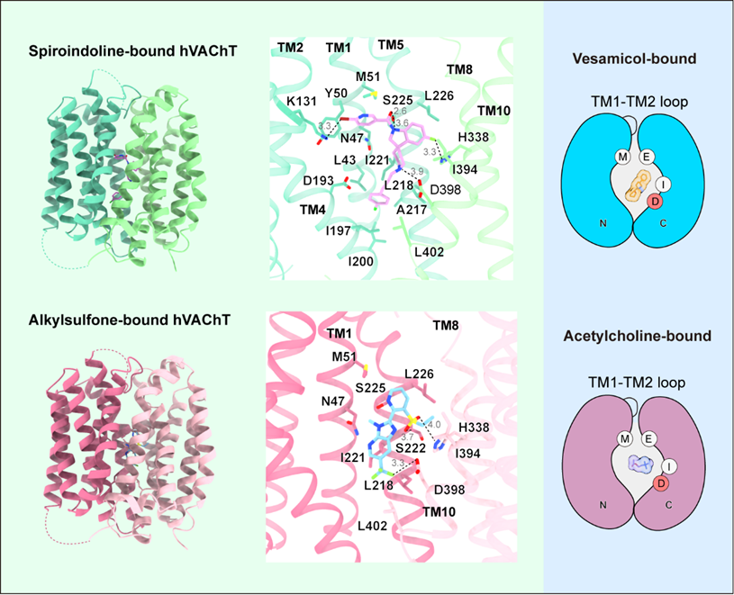 北京大学生命科学学院和生命科学联合中心张哲研究组于2025年10月30日在Structure期刊上发表题为“Structural basis of VAChT inhibition by spiroindolines and alkylsulfones”的研究论文。该研究通过冷冻电镜解析了人源VAChT蛋白与两种新型抑制剂——Spiroindoline和Alkylsulfone结合的高分辨率结构,并结合功能实验系统阐明其抑制机制。结合课题组此前发表的VAChT与底物及Vesamicol结合的结构(Zhang et al. Cell Research 2024),本研究完整揭示了VAChT在识别不同配体过程中的构象偏好与结合模式差异(图1)。