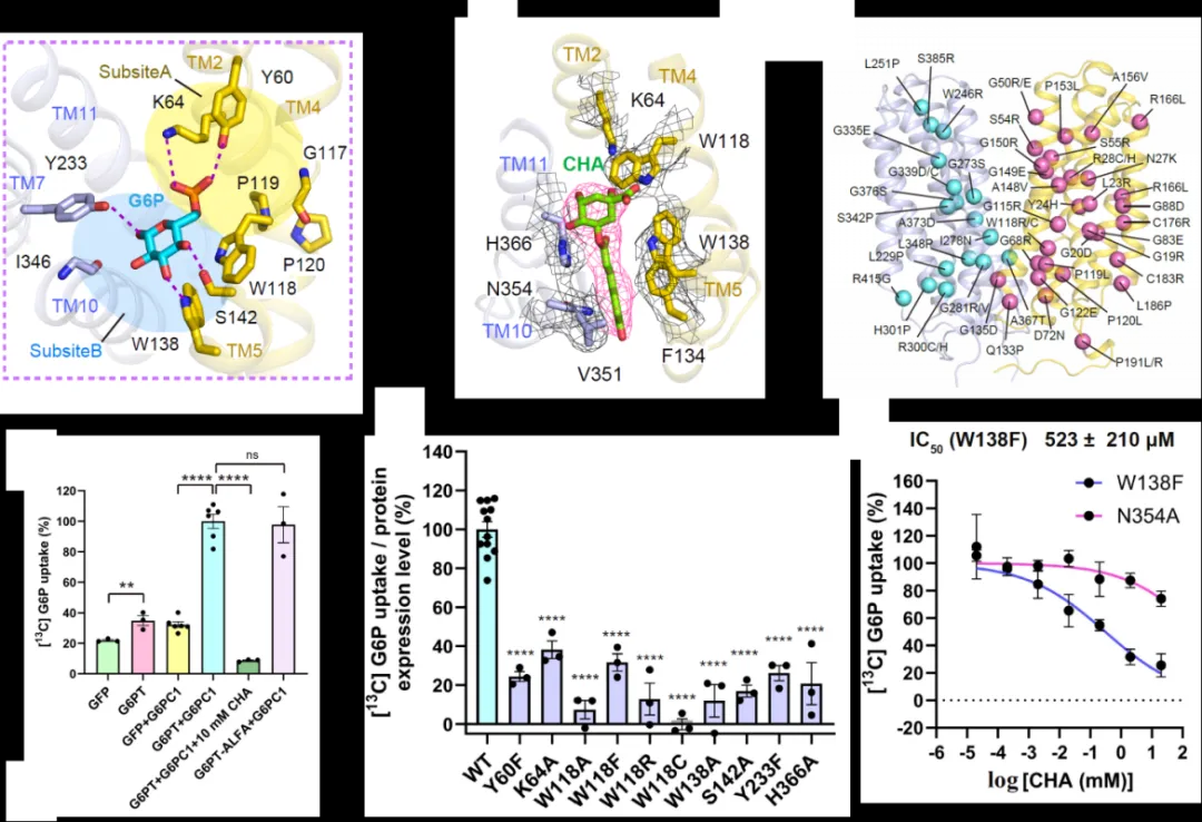 通过结构分析和定点突变实验,一方面明确了G6P在转运蛋白中的结合位点及关键相互作用残基,发现G6PT识别G6P通过“双亚位点”,亚位点A(磷酸识别区)由TM2上的Y60、K64和TM11上的H366组成,通过极性相互作用精准结合G6P的磷酸基团,亚位点B(葡萄糖识别区)由TM4上的W118、TM5上的W138和S142、TM7上的Y233等残基构成,通过氢键和范德华力固定G6P的葡萄糖部分;另一方面明确了G6PT特异性抑制剂CHA的抑制机制,揭示了其“双重抑制策略”,CHA的奎宁酸部分竞争性占据G6P的结合位点,直接阻断G6P与G6PT的结合,CHA的咖啡酸部分插入TM5与TM10之间,通过π-π堆积和范德华力固定G6PT的“内向闭塞”构象,使其无法转换为转运所需的开放状态,彻底终止G6P转运。通过将GSD-Ib的临床相关致病性突变映射到解出的三维结构上,结合功能突变实验明确了部分突变对蛋白构象、底物结合或转运过程的影响。