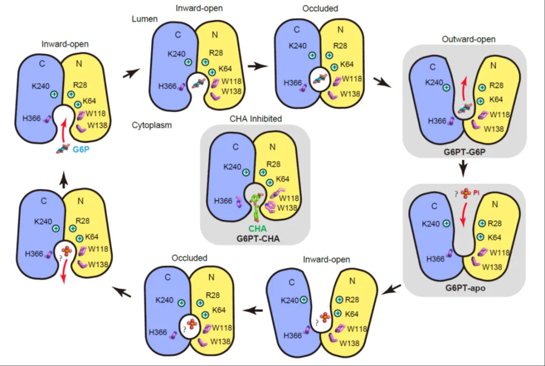 基于这些研究结果,团队提出了G6PT转运G6P及CHA抑制转运的机制,完善了对其转运过程的理解。