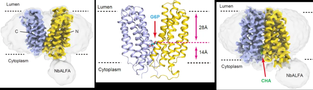 研究团队首先对G6PT的功能特性进行了深入研究,发现G6PT与葡萄糖-6-磷酸酶(G6PC1)共表达会显著增加其转运活性,基于这一发现团队创新性地建立了其转运活性测试方法。为了进一步探究其结构基础,研究团队采用ALFA标签融合策略(将短α螺旋标签引入G6PT),结合纳米抗体(NbALFA)辅助冷冻电镜分析,成功解析了G6PT处于外向开放状态(G6PT-apo)、G6PT处于外向开放状态时与G6P复合物(G6PT-G6P)和G6PT与CHA结合后处于内向闭塞状态(G6PT-CHA)的高分辨率冷冻电镜结构。