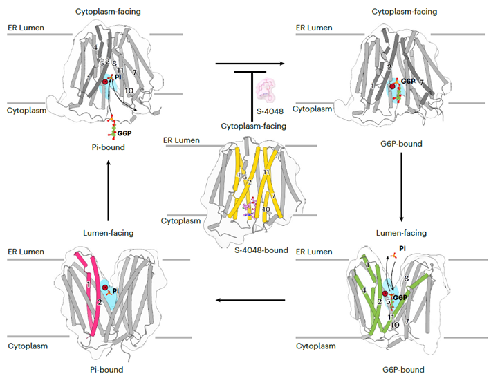 图1. SLC37A4的底物转运与抑制的工作模型