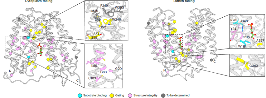 研究还发现,基于天然产物绿原酸(Chlorogenic acid,CHA)改造的高效抑制剂S-4048能够部分占据G6P结合位点,并将SLC37A4锁定在“cytoplasm-facing”构象,从而阻断其转运活性。突变实验进一步阐明了S-4048特异性识别SLC37A4而不作用于其他家族成员(SLC37A1-A3)的结构机制,为后续靶向药物开发提供了关键理论依据。此外,研究团队将已知的GSD-Ib致病突变精准定位至蛋白结构,系统揭示了这些突变通过破坏底物识别、构象转换或蛋白稳定性而导致功能丧失的分子病理机制(图2)。