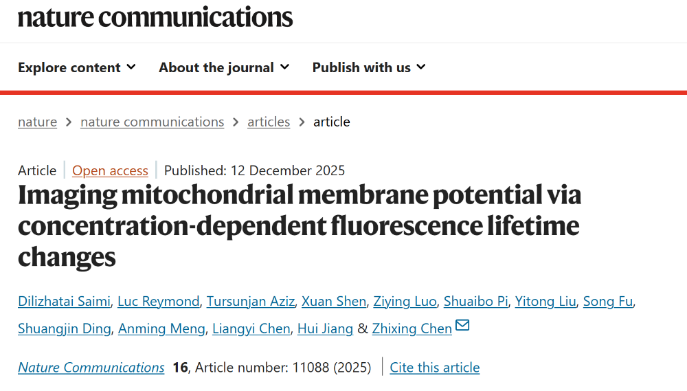 2025年12月12日,北京大学陈知行课题组在Nature Communications杂志上发表最新研究成果Imaging mitochondrial membrane potential via concentrationdependent fluorescence lifetime changes。该研究利用荧光寿命成像(FLIM)技术对2020年自主研发的PK Mito DeepRed荧光探针染色的线粒体进行成像,发现PKMDR的荧光寿命变化可灵敏反映线粒体膜电位。该技术能以高时空分辨率可视化线粒体呼吸状态,可观察单个细胞内部、类器官及组织的线粒体膜电位异质性,还能可视化线粒体运输的过程,在多种细胞中揭示了不同区域线粒体的代谢活性差异。