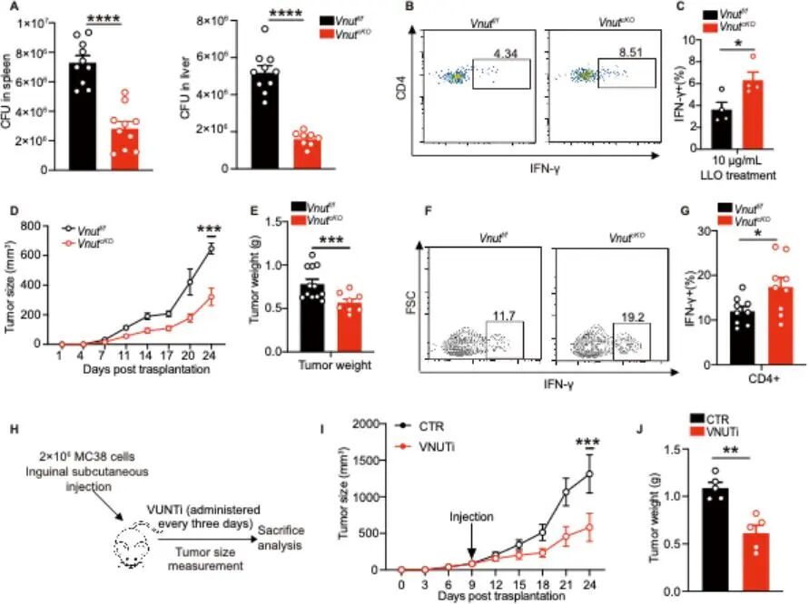 进一步功能验证实验表明,Vnut基因敲除可通过增强Th1细胞的效应功能,调控宿主的抗感染与抗肿瘤应答:一方面能显著提升小鼠对单核增生性李斯特菌感染的清除能力,增强机体抗感染免疫力(图2A-C);另一方面可有效抑制肿瘤组织的生长增殖,展现出明确的抗肿瘤活性(图2D-G)。此外,VNUT特异性抑制剂的干预实验显示,其同样能发挥一定的肿瘤生长抑制作用(图2H-J)。