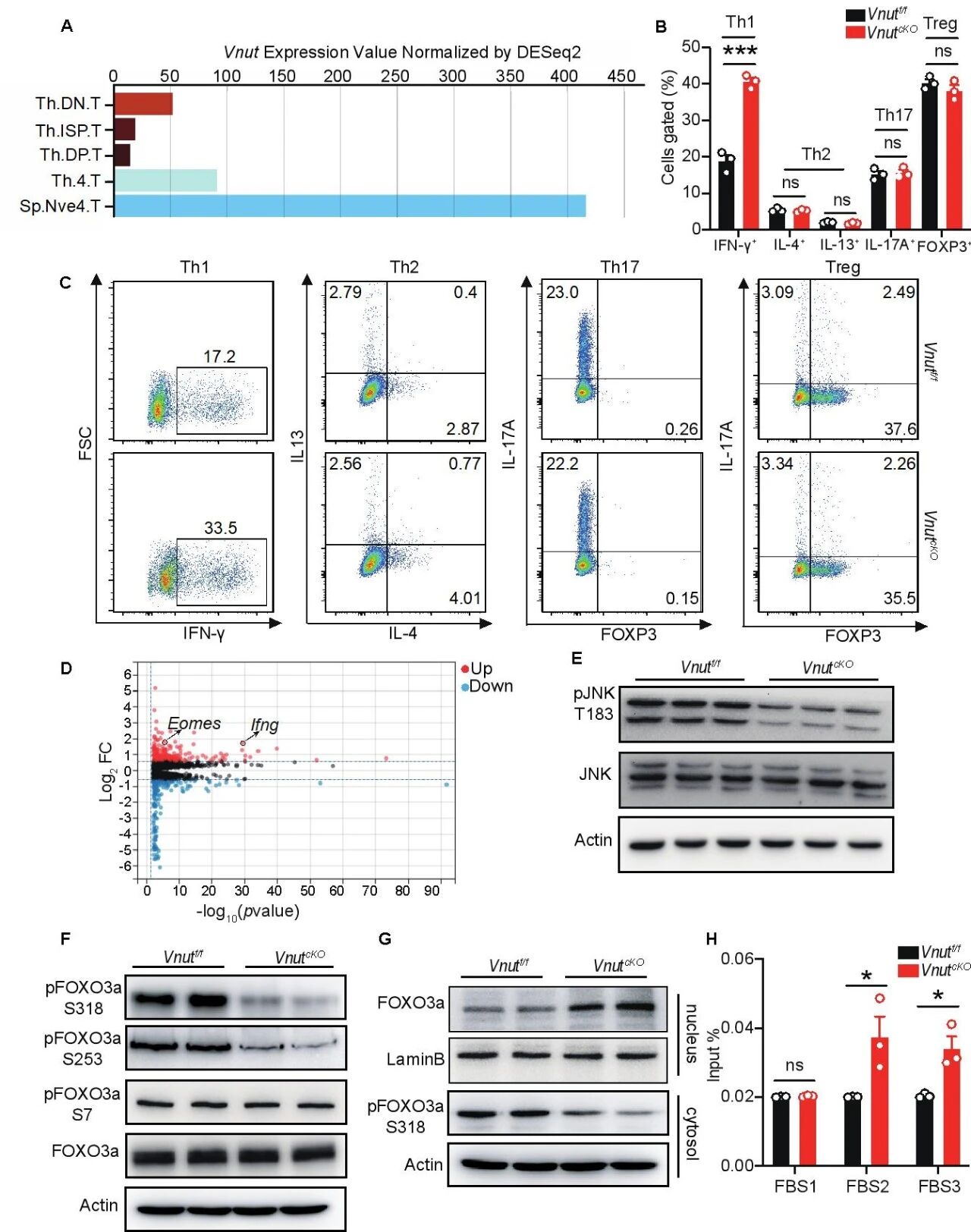 本研究首先发现VNUT在CD4⁺ T细胞发育成熟后,其表达量呈显著上调趋势(图 1A)。为探究VNUT在CD4⁺ T细胞分化中的功能,利用loxp-cre条件性敲除技术,构建了CD4⁺ T细胞特异性Vnut基因敲除(cKO)小鼠模型。体外诱导分化实验结果显示,与野生型相比,cKO小鼠来源的CD4⁺ T细胞向Th1亚型的分化能力显著增强,具体表现为Th1细胞比例升高及特征细胞因子IFN-γ表达上调(图 1B、C)。为解析上述表型的分子机制,对cKO小鼠来源的Th1细胞进行RNA-seq分析,发现转录因子Eomes的mRNA水平均显著升高(图 1D)。进一步的机制探究表明,VNUT通过调控CD4⁺ T细胞受体(TCR)刺激后的ATP释放,进而影响ATP受体P2X7R的活化状态;而P2X7R的活化差异会进一步传导至下游信号通路,调控JNK激酶的磷酸化水平(图 1E)。后续实验证实,磷酸化的JNK可直接作用于转录因子FOXO3a,通过磷酸化修饰调控其核质穿梭及亚细胞定位(图 1F、G),进而影响FOXO3a对Eomes基因的转录调控活性(图 1H)。最终,通过这一“VNUT-ATP-P2X7R-JNK-FOXO3a-Eomes”的级联调控通路,VNUT实现了对CD4⁺ T 细胞向Th1亚型分化过程的调控。