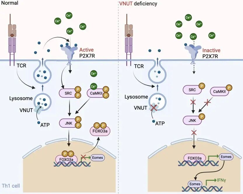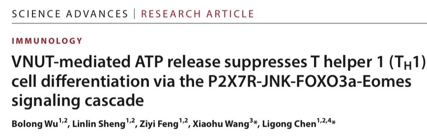 2025年12月19日,实验室陈立功团队及其合作者以“VNUT介导的ATP释放通过P2X7R-JNK-FOXO3a-Eomes信号级联抑制辅助性T细胞(Th)1型分化”(VNUT-mediated ATP release suppresses T helper (Th) 1 cell differentiation via the P2X7R-JNK-FOXO3a-Eomes signaling cascade)为题在《科学进展》(Science Advances)杂志在线发表研究论文,该研究报道了ATP转运蛋白VNUT通过调控P2X7R-JNK-FOXO3a-Eomes信号通路对Th1细胞的分化产生了调控作用。