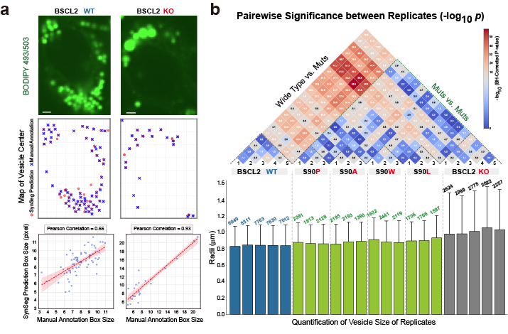 图2 扩展 SynSeg 框架用于疾病相关细胞定量分析。 (a) BSCL2 野生型(WT)细胞,与基因敲除(KO)细胞荧光图像,表明该模型能够准确测量两种细胞类型中的脂滴(LD)尺寸。(b) BSCL2 WT、KO 及四种错义突变体脂滴尺寸的定量比较与统计分析。热图呈现了所有生物学重复之间两两比较的结果,颜色越深、表示被比较的两组之间的统计显著性越大。