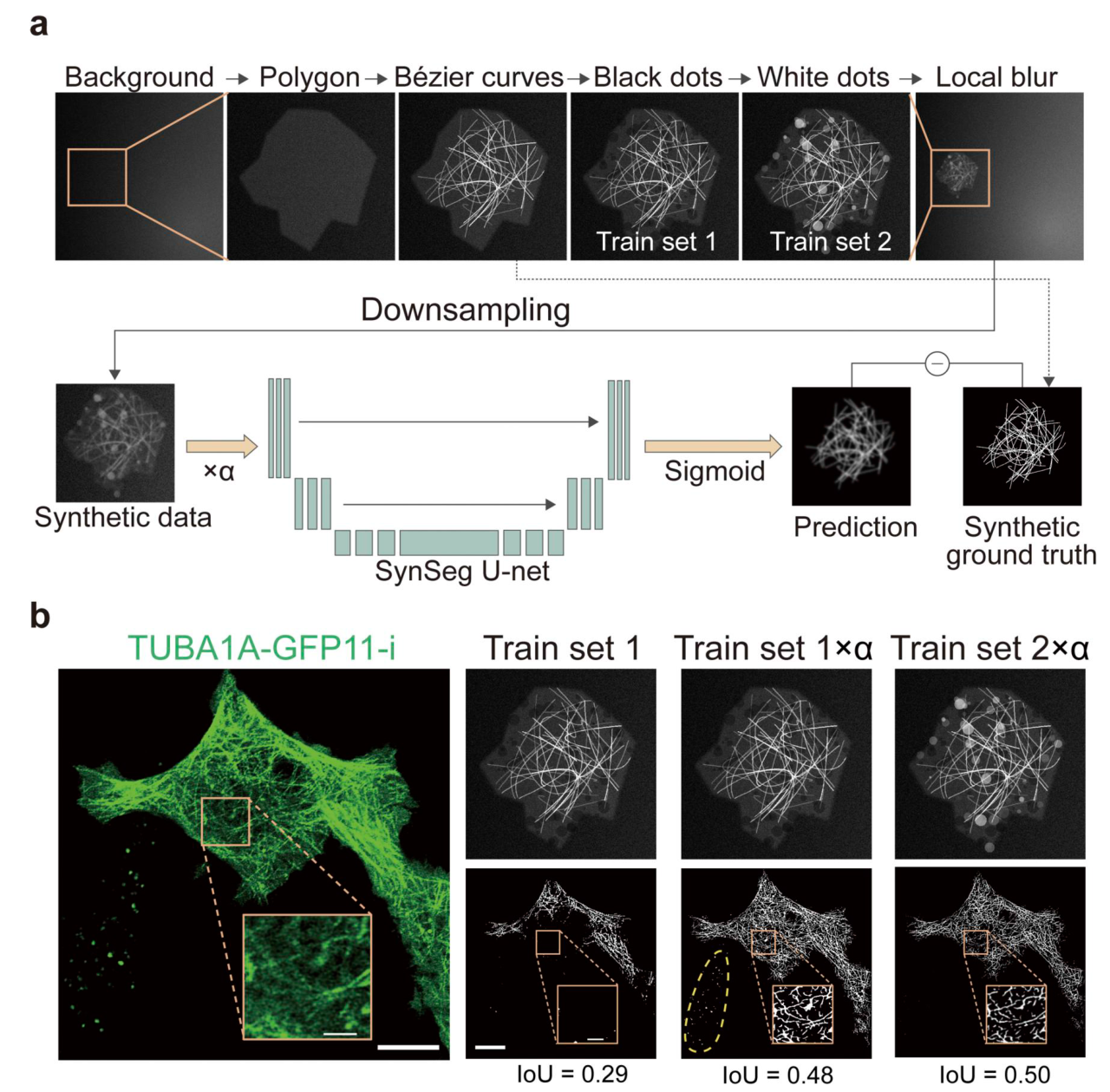 图1 细胞骨架为例分割模型。 (a) 合成细胞骨架数据集生成与U-Net模型架构。(b) 基于 Airyscan 成像对 split-GFP 标记的 TUBA1A 进行细胞骨架分割。