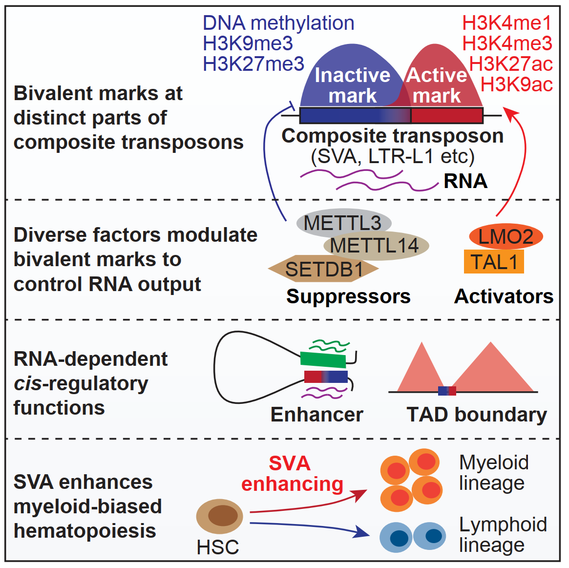 转座元件(Transposable Element, TE;又称为转座子transposon)是基因组中可以发生跳跃的DNA元件,人类基因组中的转座子序列约占45%。长期以来,转座子被认为是基因组中的垃圾序列,然而近年来越来越多的研究发现转座子对于基因组的进化、基因的表达调控等方面具有重要作用。此外,转座子在基因组中的不断插入还可以形成复合型的DNA元件以及新的转录单元,例如,复合型转座子SINE-VNTR-Alu(简称SVA),其序列组成上是由Alu-like序列、串联重复序列VNTR和来源于HERV-K的SINE-R序列等重复序列复合而成。进化上,SVA起源于约2500万年前,是人基因组特异的且最为年轻的一类复合型转座子,已有的体外实验提示其VNTR区域具有异染色质功能,而SINE-R区域具有增强子活性【5-7】。然而,复合型转座子SVA元件上具有不同功能的区域及各自携带的染色质修饰在基因组上是如何被调控的,以及它们之前的协同调控如何影响SVA的转录及生物学功能,目前仍然未知。