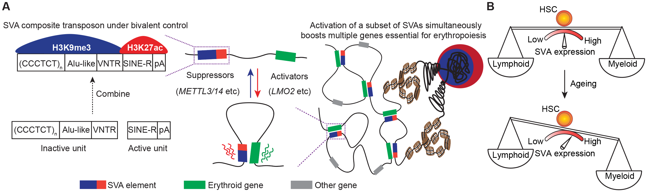功能上,研究人员发现LMO2或METTL3/14通过调控SVA的表达会影响SVA周围基因的表达,即类似增强子的活性。为了进一步验证SVA的RNA依赖性增强子活性,研究人员通过CRISPRa/i、Hi-C、SVA deletion,、SVA反义核苷酸(ASO)处理等方法,系统验证了SVA依赖其RNA并通过染色质环(chromatin loop)接触并激活远程基因表达的增强子功能。进一步,研究人员在造血干细胞的红细胞分化、髓系/淋系双向分化过程中,发现SVA在包括红细胞分化和单核-巨噬细胞分化在内的髓系分化中表达上调,而在淋系分化中表达下降。且不同的SVA亚群通过与不同谱系的特异性基因形成loop激活相应谱系发育基因的表达。当用ASO敲低SVA的RNA后,造血干细胞分化产生的髓系比例下降而淋系比例升高。最后,研究人员关注到衰老相关的髓系偏好性造血现象,并发现衰老造血干细胞中SVA表达上调是导致衰老造血系统中髓系分化比例偏高的原因。而通过敲低SVA的表达,可以使衰老造血干细胞的髓系/淋系分化比例很大程度地恢复至年轻造血干细胞的水平,从而揭示了SVA对于造血系统分化发育过程及造血衰老中重要生理意义(图1)。
