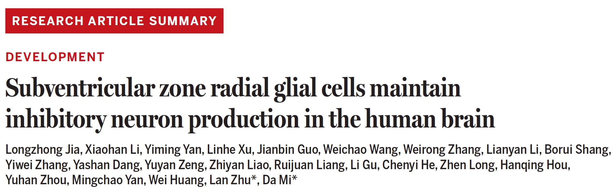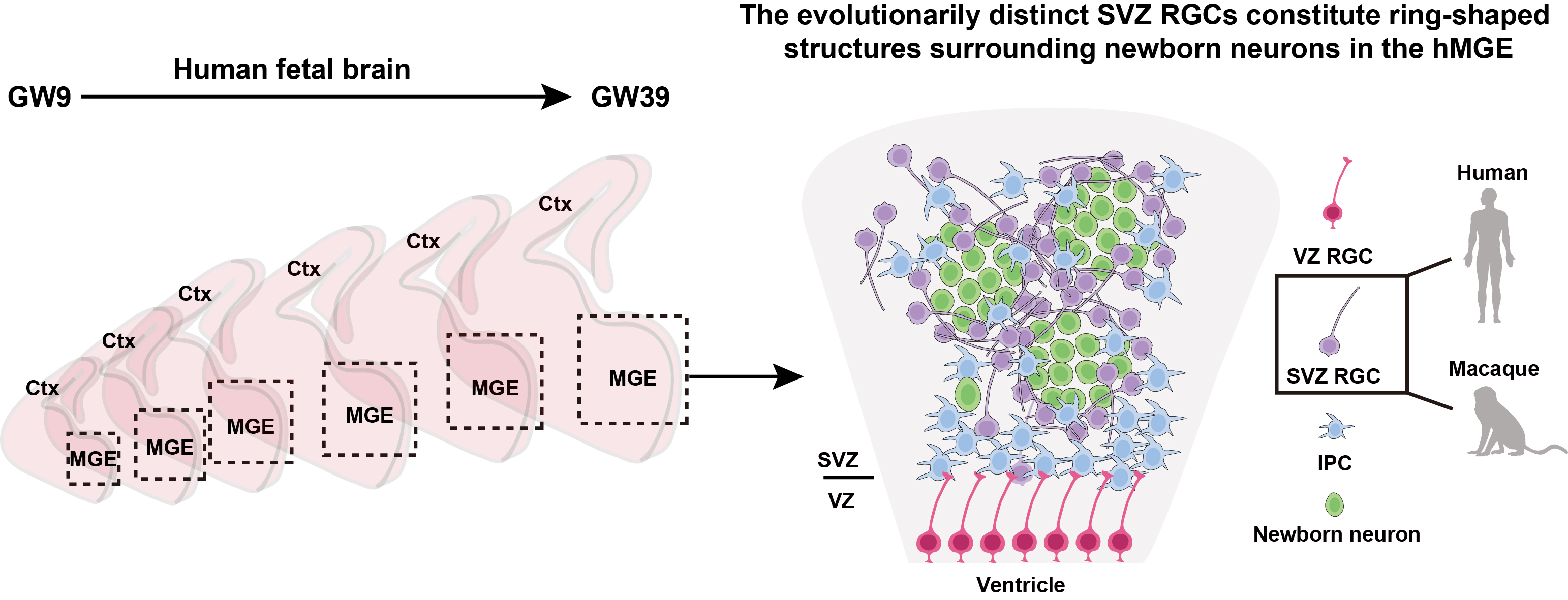 2026年1月15日,实验室米达团队联合中国医学科学院北京协和医院朱兰院士团队在《科学》(Science) 发表了一项突破性研究“脑室下区放射状胶质细胞维持人脑抑制性神经元的持续产生” (Subventricular zone radial glial cells maintain inhibitory neuron production in the human brain)。该研究聚焦人脑动态发育过程,基于珍贵样本系统绘制了人类大脑内侧神经节隆起(MGE)脑区的细胞发育图谱,首次在人类胎儿大脑中发现了一类独特的神经干细胞类型—— SVZ RGC(脑室下区放射状胶质细胞),并揭示SVZ RGC在人类妊娠期中持续产生抑制性神经元和神经胶质细胞,从而增加了人类大脑皮层抑制性神经元的数量及比例。这项研究为深入理解人类特有的大脑抑制性神经元发育机制和在进化上大脑皮层扩张机制提供了重要理论基础。鉴于抑制性神经元的功能缺陷与癫痫、自闭症等多种神经系统疾病密切相关,这类新型神经干细胞的发现将为未来相关疾病的潜在干预策略开辟新的方向。