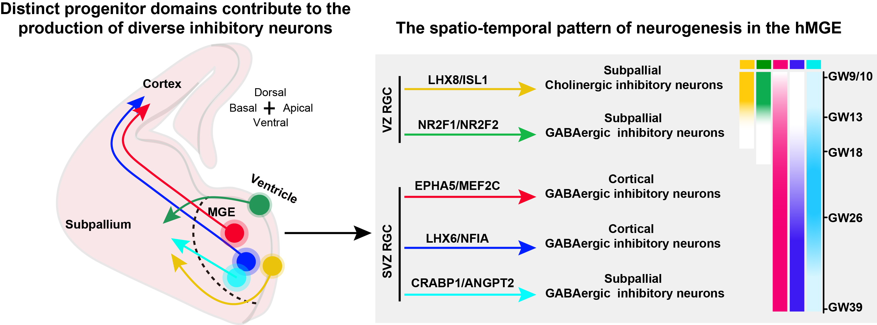 人类大脑神经元的惊人多样性是支撑高级脑认知功能的根本基石。人类大脑中数量巨大、种类繁多的神经元是如何由数量和种类都相对有限的神经干细胞有序产生的,是神经科学领域的核心科学问题。本研究系统绘制了人类胎儿MGE脑区的神经发生时空图谱,揭示了人类大脑抑制性神经元多样性产生的核心机制。研究发现人类MGE中存在高度区隔化的神经祖细胞域(progenitor domain),并且该祖细胞域与多种抑制性神经元谱系之间具有明确对应关系。同时,研究揭示人类MGE中的神经发生具有严格的时空规律:发育早期,位于脑室区(VZ)的LHX8/ISL1+和NR2F1/NR2F2+祖细胞域率先进行神经发生;发育后期,位于脑室下区(SVZ)的EPHA5/MEF2C+,CRABP1/ANGPT2+和LHX6/NFIA+祖细胞域成为了主要的神经发生场所。这些结果表明,在人类大脑发育过程中部分抑制性神经元类型的身份早在祖细胞阶段就已建立,并受到其“出生地”和“出生时间”的严格限制。