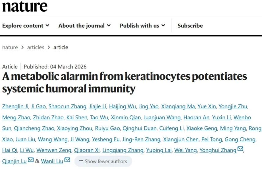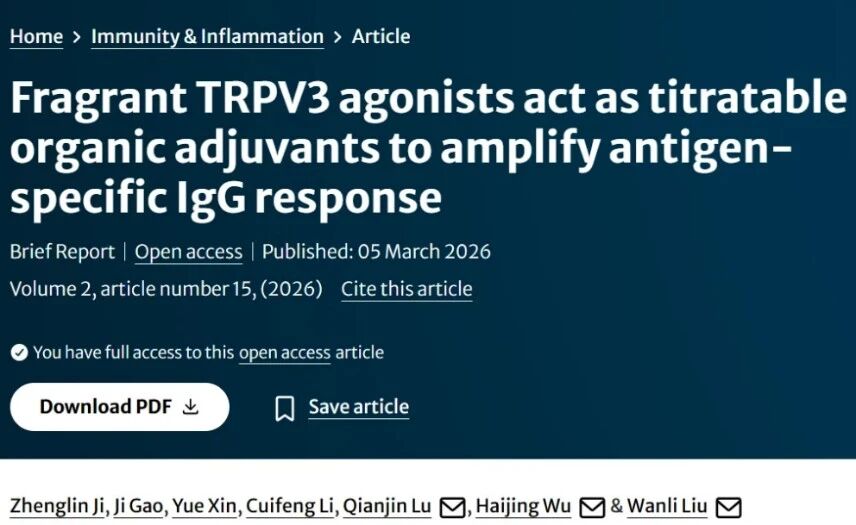 原文链接:[1] Ji, Z., Gao, J., Zhang, S. et al. A metabolic alarmin from keratinocytes potentiates systemic humoral immunity. Nature (2026). https://doi.org/10.1038/s41586-026-10167-6[2] Ji, Z., Gao, J., Xin, Y. et al. Fragrant TRPV3 agonists act as titratable organic adjuvants to amplify antigen-specific IgG response. Immun. Inflamm. 2, 15 (2026).