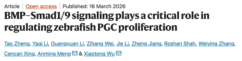 2026年3月16日,实验室孟安明院士团队在《自然-通讯》(Nature Communications)期刊发表题为“BMP–Smad1/9信号调控斑马鱼PGC增殖”(BMP–Smad1/9 signaling plays a critical role in regulating zebrafish PGC proliferation)的研究论文,该研究明确了BMP-Smad信号并不参与斑马鱼的PGCs命运决定和迁移调控,而是通过调控DNA损伤应激通路ATR维持PGCs数目。从演化-发育(Evo-Dev)角度阐明了BMP信号通过不同分子机制参与先成模式和诱导模式生物的PGCs发育调控。