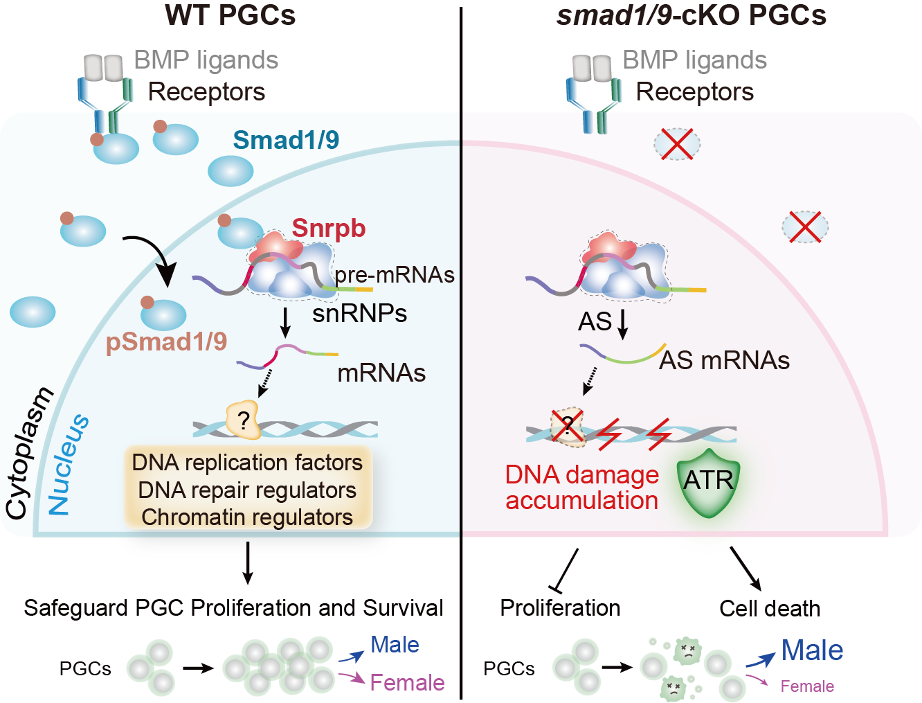 机制研究表明BMP–Smad1/9信号帮助斑马鱼PGCs抵御DNA复制压力(replication stress)。PGCs转录组分析显示,smad1-cKO PGCs细胞周期检验点与DNA损伤应答相关基因显著上调;且生殖质相关基因表达并未发生改变,指示PGCs细胞命运决定并不受BMP-Smad信号调控。pChk1免疫荧光染色结果显示ATR–pChk1信号通路在突变体PGCs中异常活跃,研究人员利用ATR抑制剂处理突变体胚胎可有效挽救突变体胚胎的PGCs数量减少的表型。有趣的是,PGCs转录组分析发现了参与调控染色质结构、DNA损伤修复及细胞周期相关基因的剪接(splicing)出现了异常。免疫共沉淀和胚胎成像结果显示Smad1可直接与剪接体核心组分Snrpb相互作用,这提示Smad1/9在斑马鱼PGCs中可能通过调控mRNA的剪切参与DNA复制压力响应及细胞周期与应激的调控。