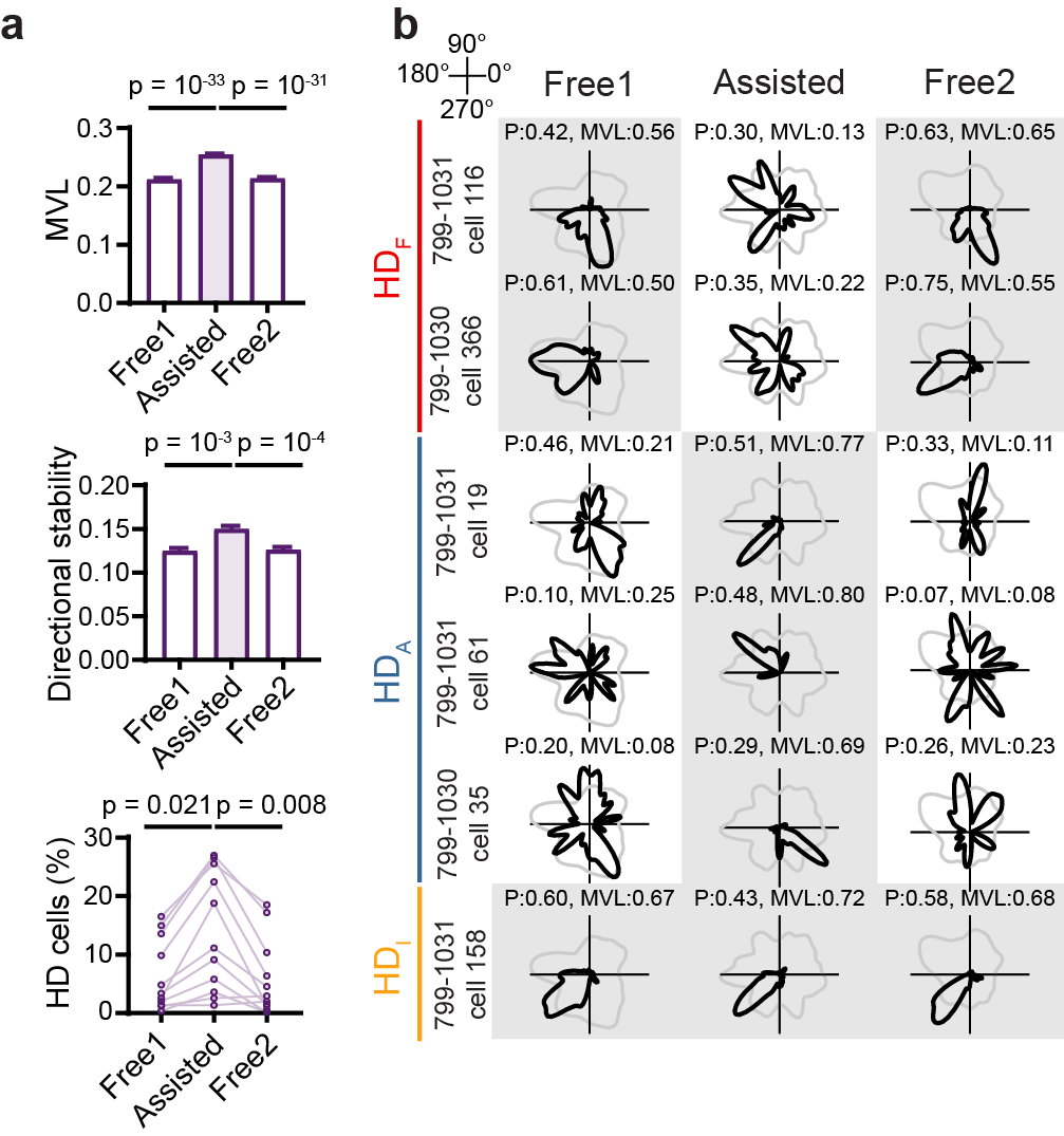研究发现,当小鼠由自由探索(free exploration)切换至被动移动(assisted movement)后,内嗅皮层的头向调制能力并没有因为行为受限而瓦解,反而呈现整体增强的趋势。单细胞水平的分析揭示了三种截然不同的响应模式:原本在主动运动中具有头向表征特性的细胞,在行为约束下表现为功能丧失(HDF)或功能维持(HDI);而令人惊讶的是,部分在主动探索中本无头向表征的神经元(HDA),在行为约束下“获得”了头向编码能力。这一现象表明,内嗅皮层的空间表征并非固化的神经标签,而是在行为约束下发生了功能重构。