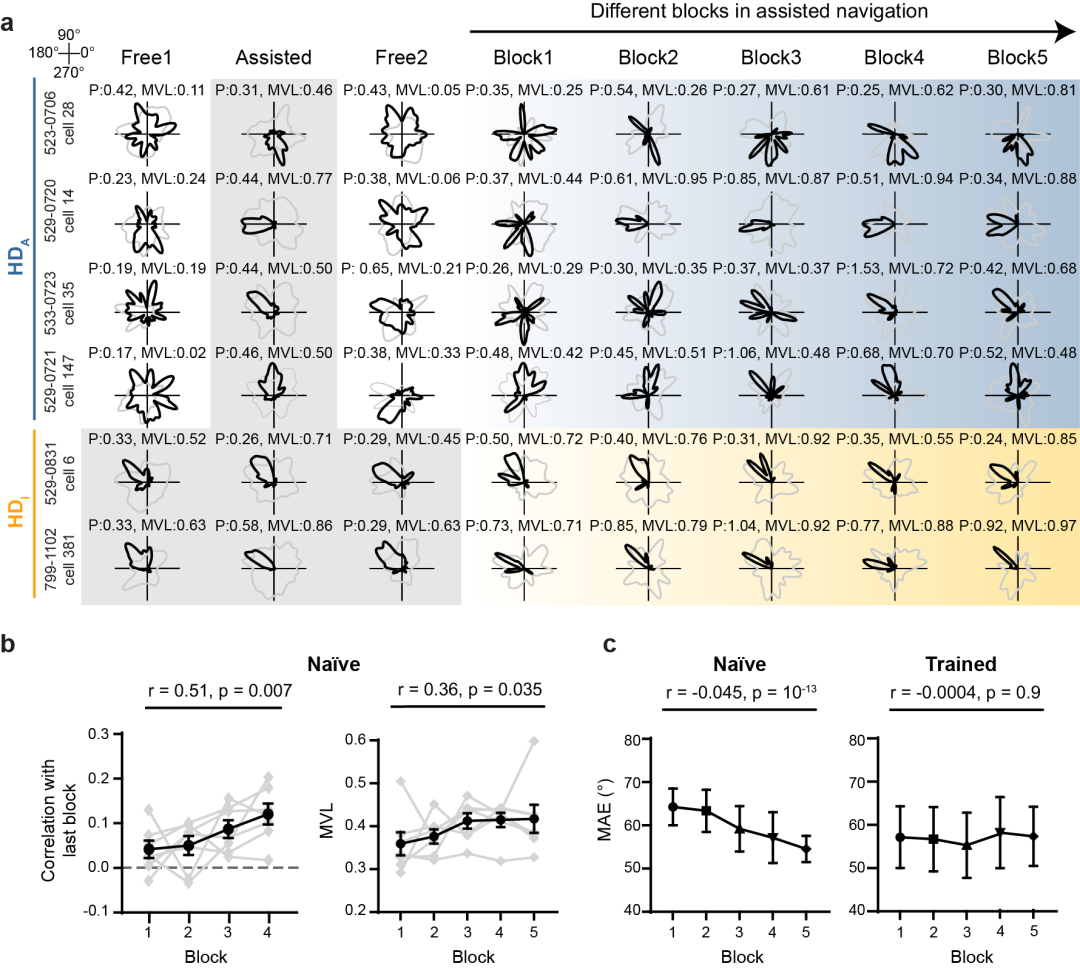 在缺乏主动运动指令的情况下,这种新型头向编码的信息来源是什么?实验证明,被动移动下的头向编码高度依赖于外部感官线索的丰度(如视觉和嗅觉参照物),而与小车的运动速度无关。进一步分析显示,这种表征的重构并非瞬时完成,而是一个依赖经验的动态学习过程。通过将被动移动阶段按时间顺序平均划分成五个阶段(blocks),研究发现在初次接受行为约束的小鼠(naïve)中,HDA细胞的头向编码随着时间推移逐渐形成并趋于成熟,而这种学习现象在HDI细胞中并不存在。这种新构建的“空间地图”一旦形成便具有较高的稳定性,可被系统长期保存,以便在后续类似的交互模态中被精准调用。