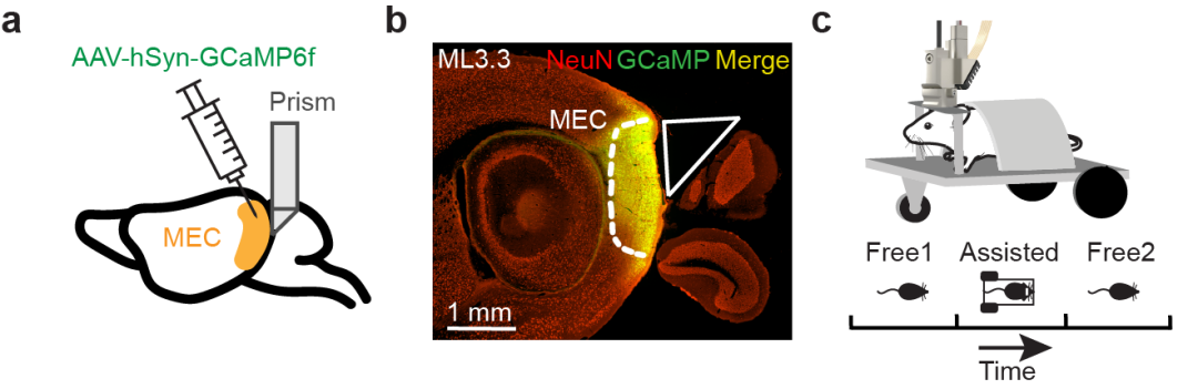 为了探究行为约束如何影响空间表征,研究团队设计了一项实验:将小鼠头部固定在可自由移动的小车上,由小车带动小鼠在环境中被动移动。研究人员利用微型化双光子成像技术,实时记录了小鼠内嗅皮层在这一特殊交互模态下的神经活动。