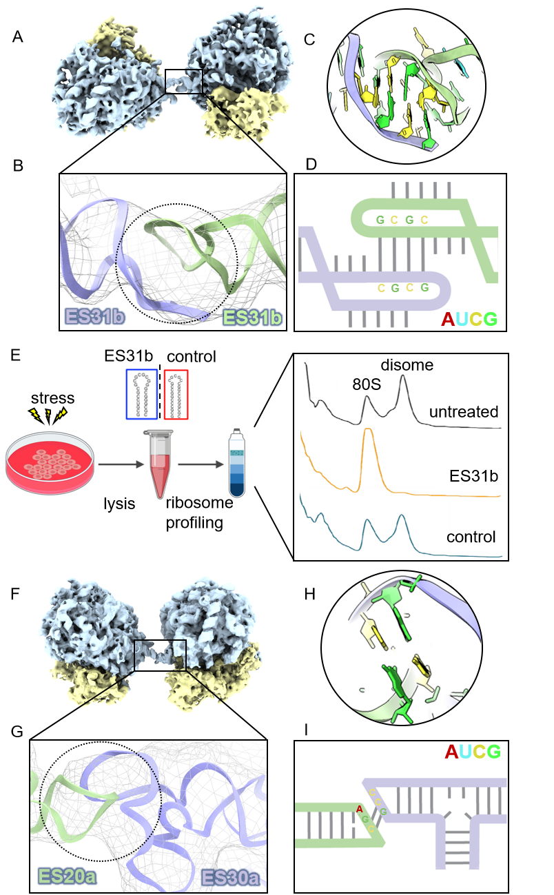 图1:rRNA扩展片段介导的核糖体二聚化机制。A–D. 核糖体rRNA扩展片段ES31b介导二聚体的形成。E. RNA竞争实验验证二聚体相互作用界面;F–I. 核糖体rRNA扩展片段ES30a和ES20a介导的另一类二聚体形成。